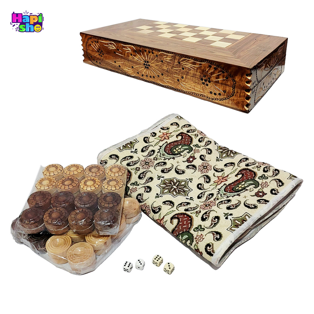 متعلقات: 2 مدل مهره چوبی با طرح متفاوت از جنس گردو و گلابی، 2 جفت تاس شامل سرامیکی سنگین و مالزی، کاور ترمه شیک و سنتی