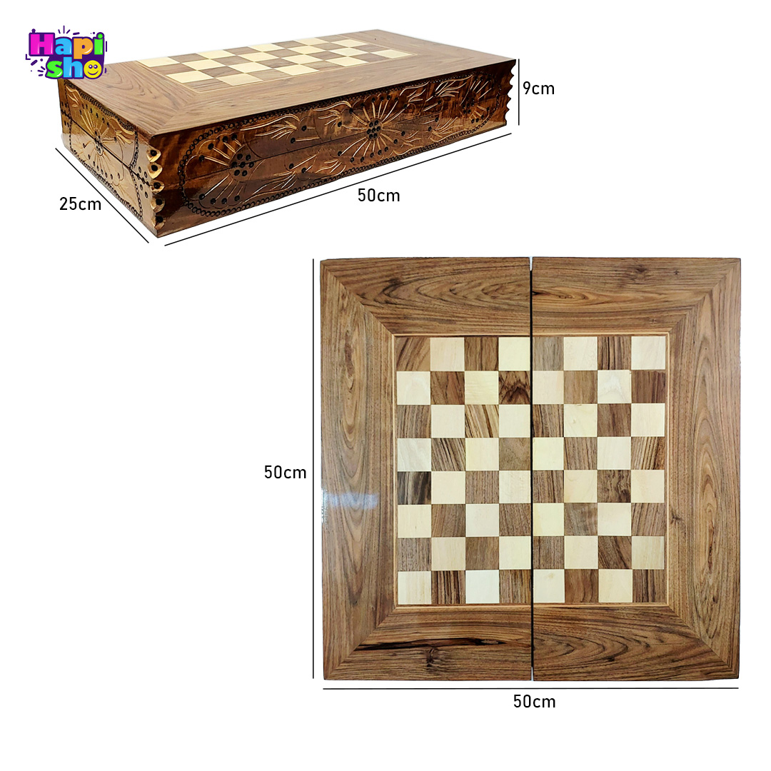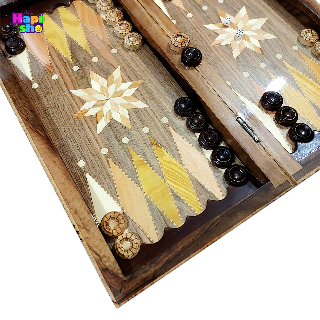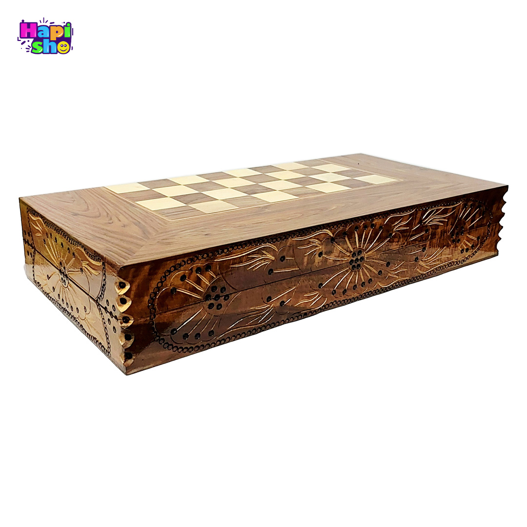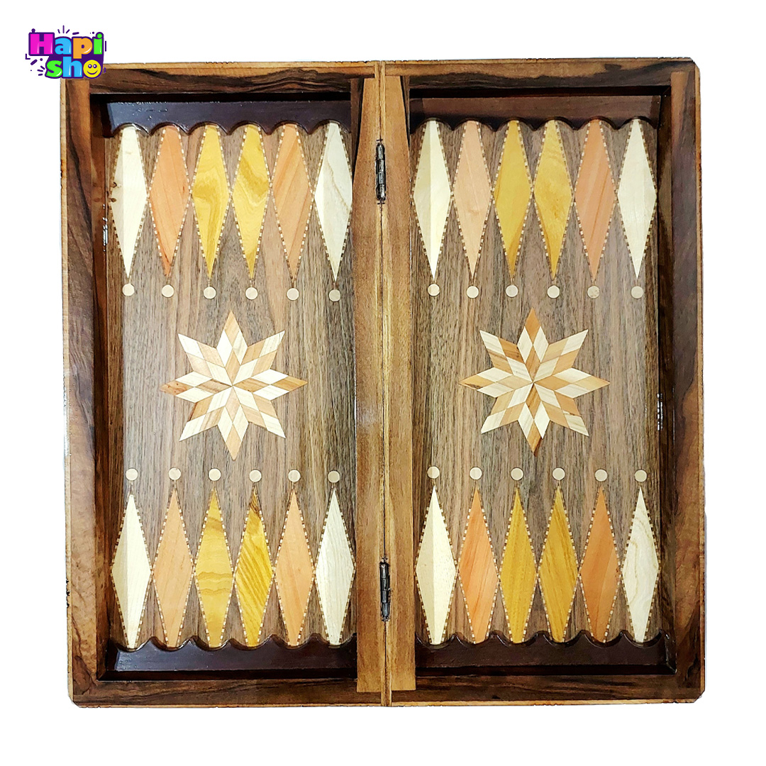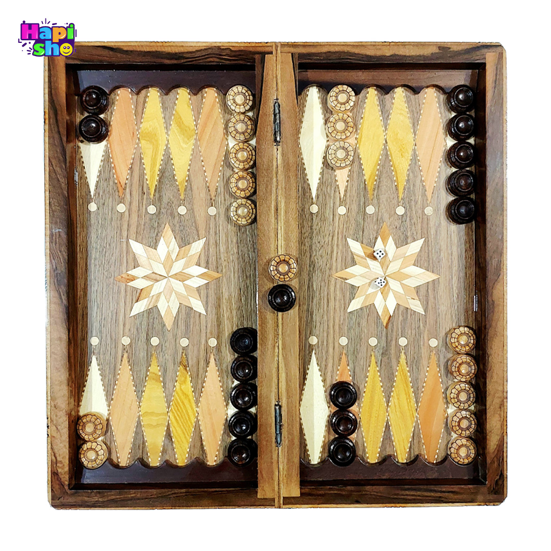 | سایر ویژگی | دارای صفحه شطرنج، معرق کاری ستاره، منبت کاری کامل دور تخته نرد، دارای خطوط مارس معرق کاری شده، لاک پلی استر جهت جلوگیری از خط و خش و اکسید شدن |