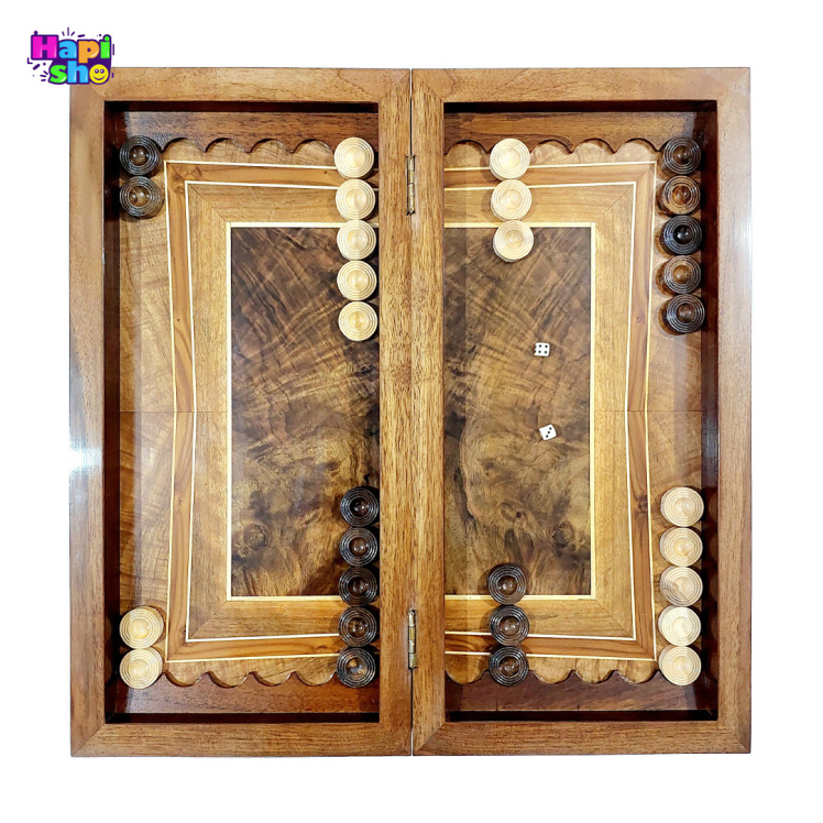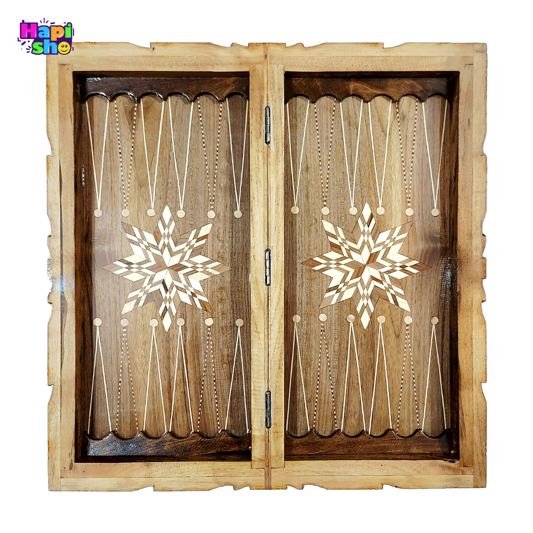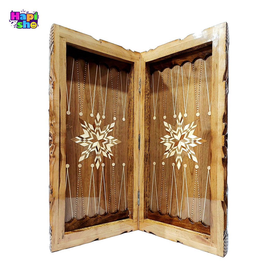 | سایر ویژگی | تمام منبت کاری شده بر روی در و روی تخته نرد، دارای صفحه شطرنج، معرق کاری ستاره کف تخته نرد، دارای خطوط مارس معرق کاری شده، لاک پلی استر جهت جلوگیری از خط و خش و اکسید شدن |