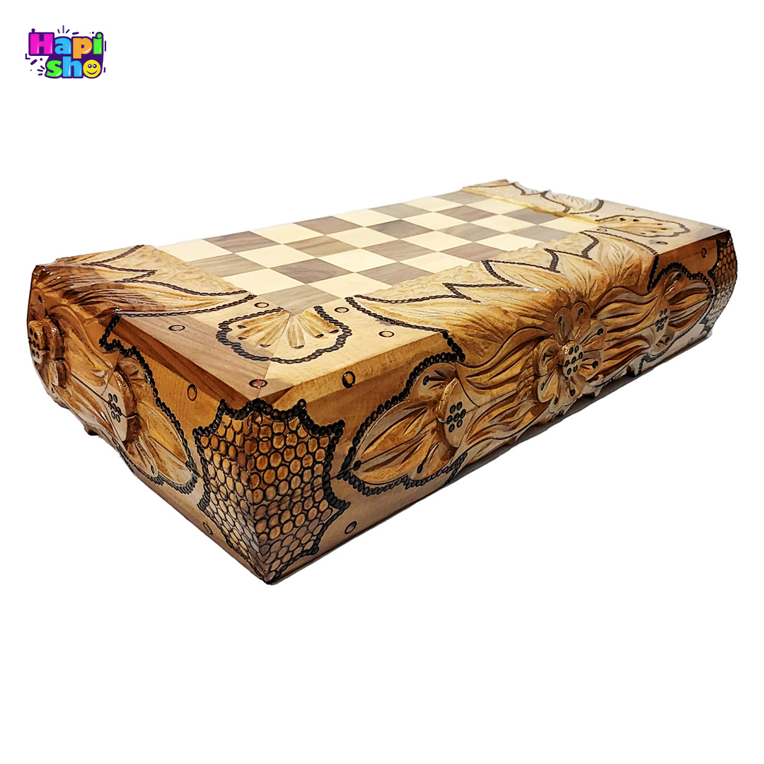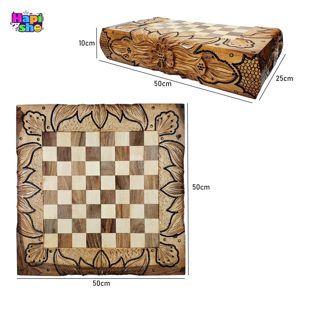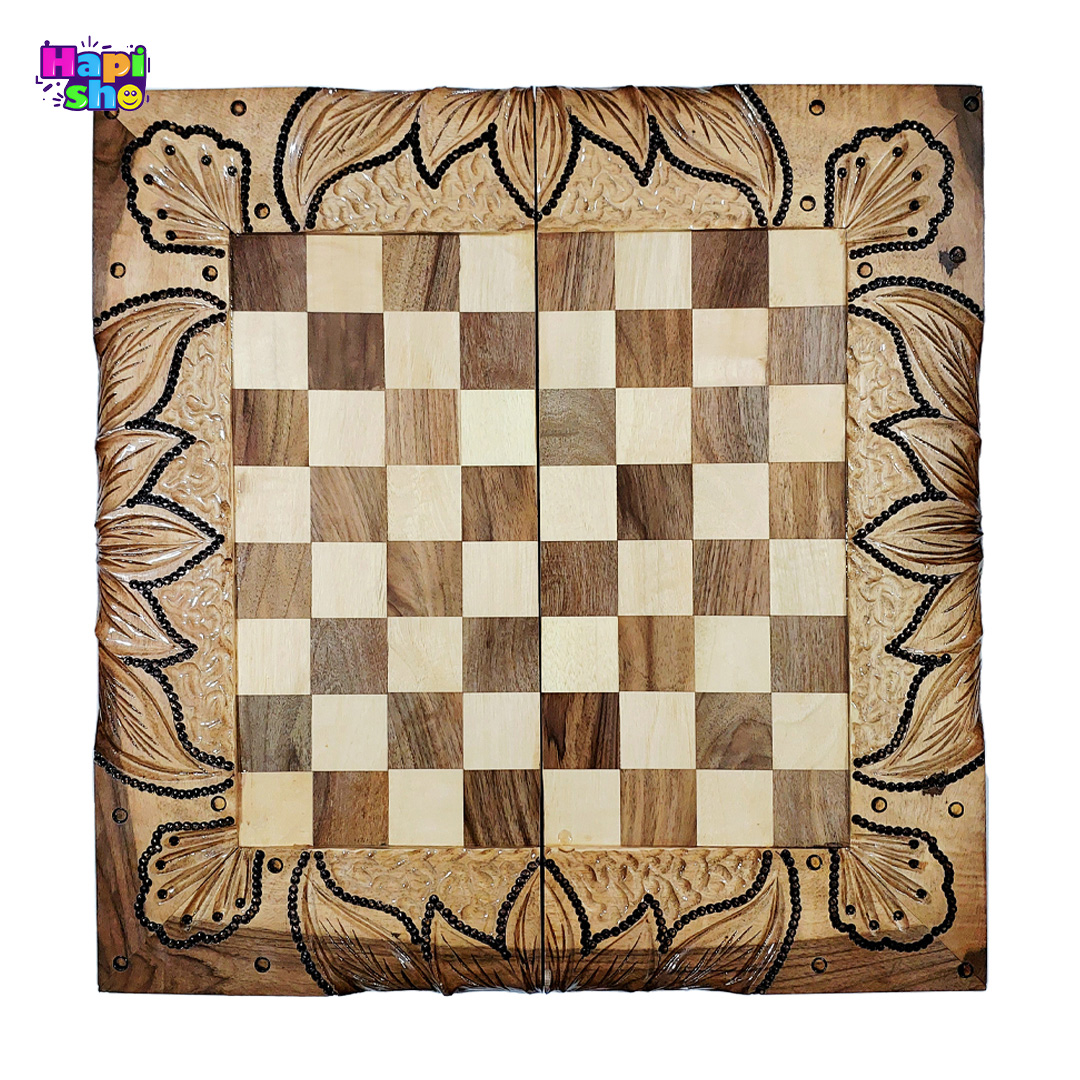 | سایر ویژگی | تمام منبت کاری شده بر روی در و روی تخته نرد، دارای صفحه شطرنج، معرق کاری ستاره کف تخته نرد، دارای خطوط مارس معرق کاری شده، لاک پلی استر جهت جلوگیری از خط و خش و اکسید شدن |