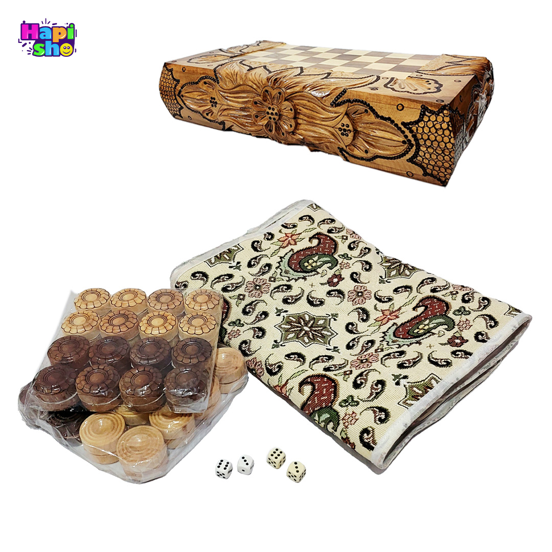 متعلقات: 2 مدل مهره چوبی با طرح متفاوت از جنس گردو و گلابی، 2 جفت تاس شامل سرامیکی سنگین و مالزی، کاور ترمه شیک و سنتی