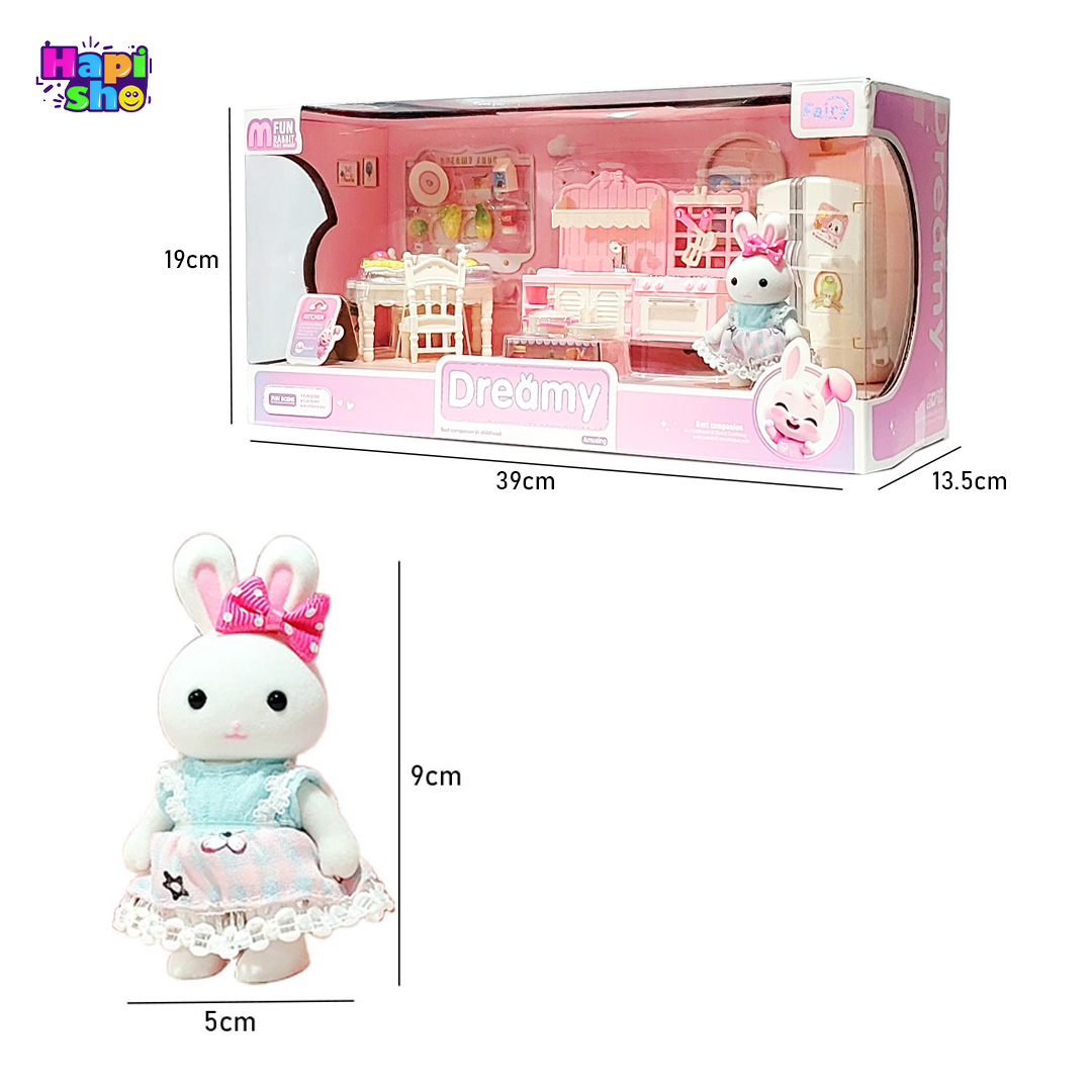 اقلام کامل و متنوع بازی: شامل عروسک خرگوش، یخچال، کابینت با اجاق و سینک، میز و صندلیها، ظروف و خوراکیها