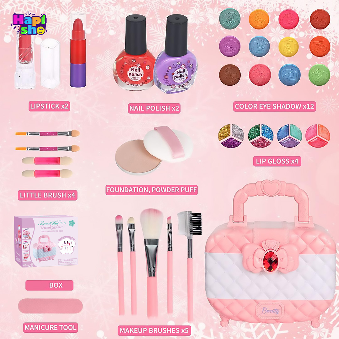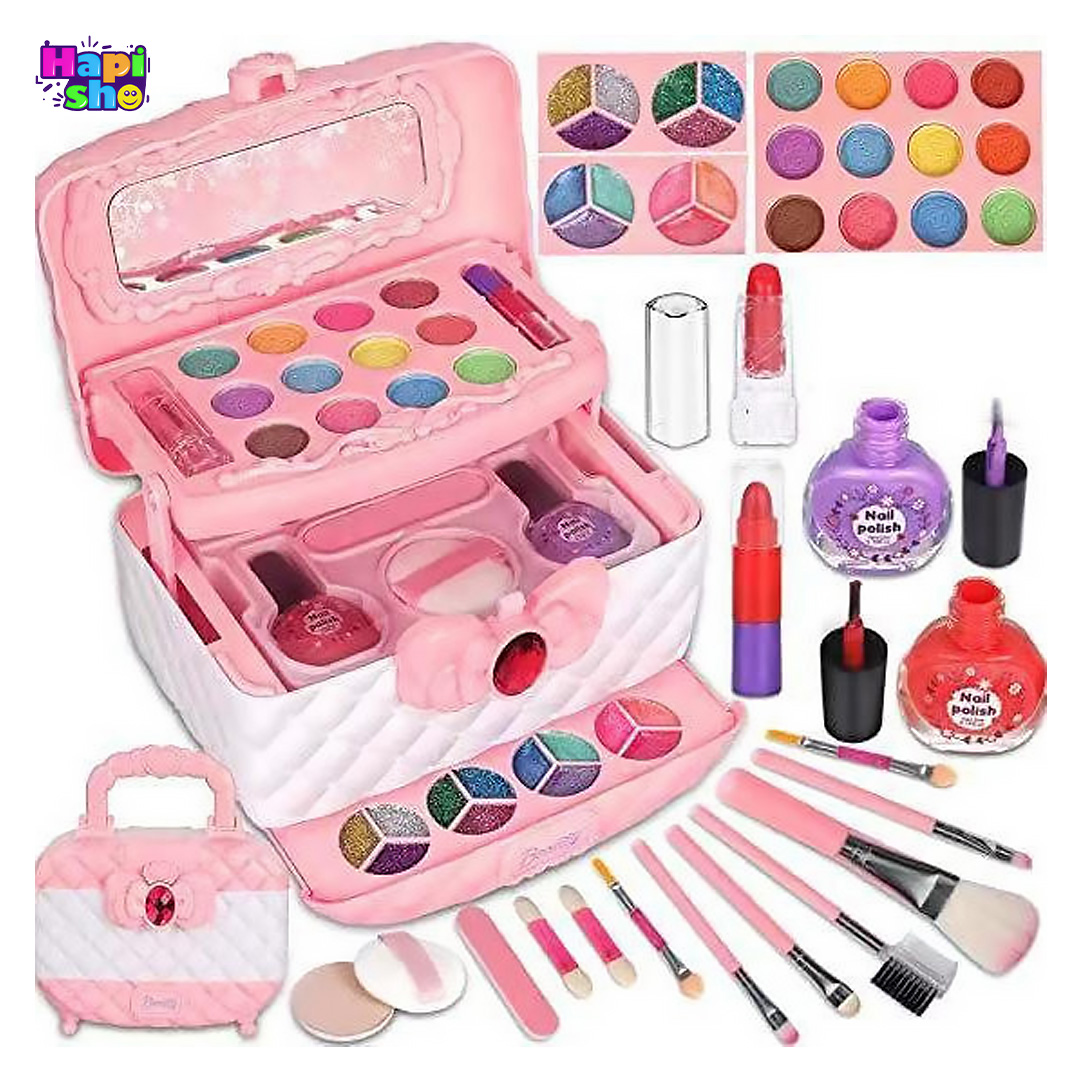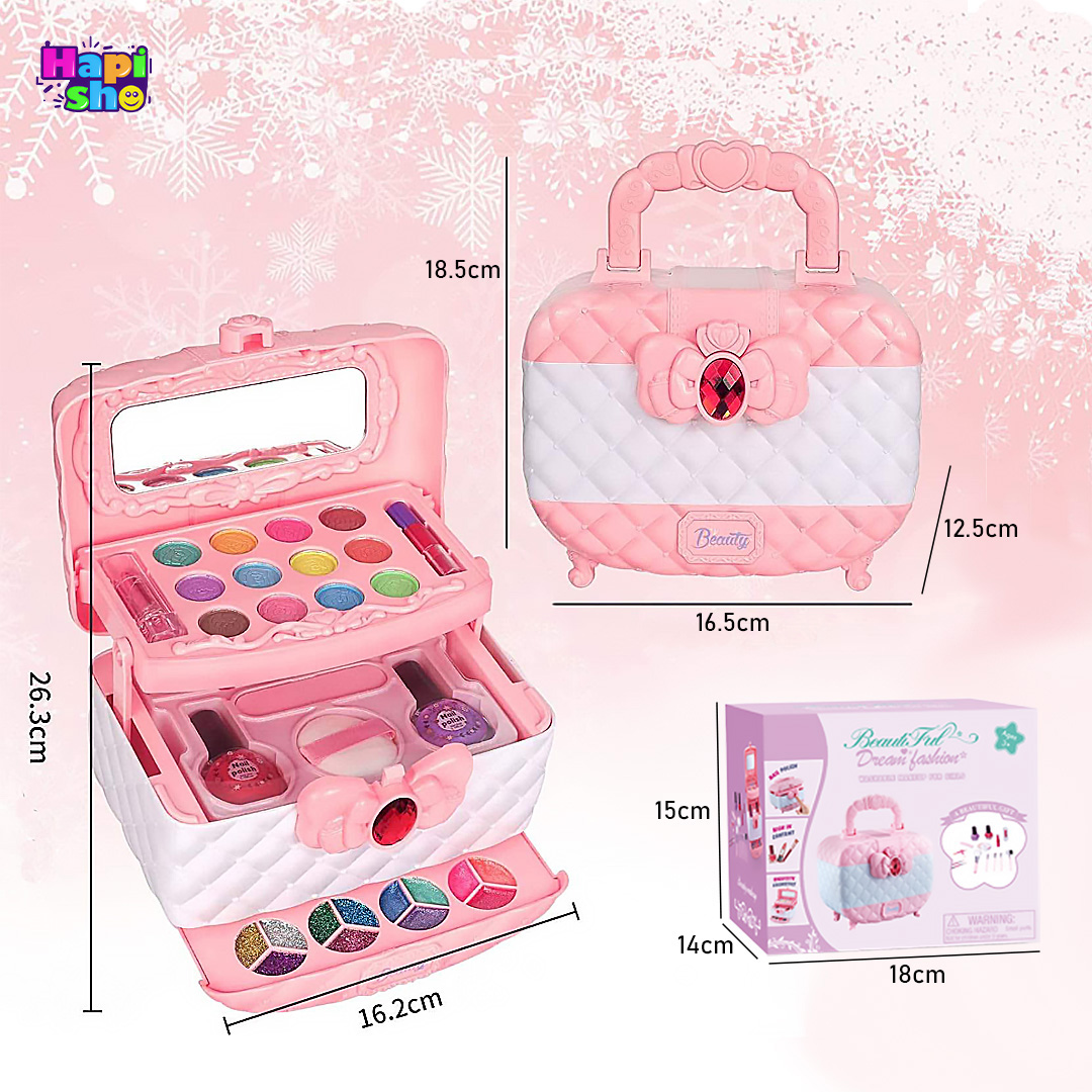 ویژگی: طراحی دخترانه جذاب، ساختار 3 طبقه کاربردی، کیف قابل حمل، لوازم واقعی ضدحساسیت و قابل شستشو، دارای آینه نشکن، وارداتی
